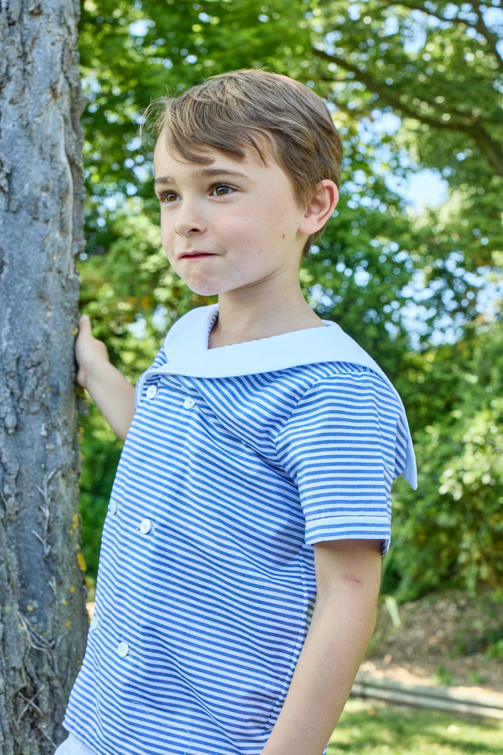 Lucien, chemise garçon en popeline blanche passepoil en lin menthe