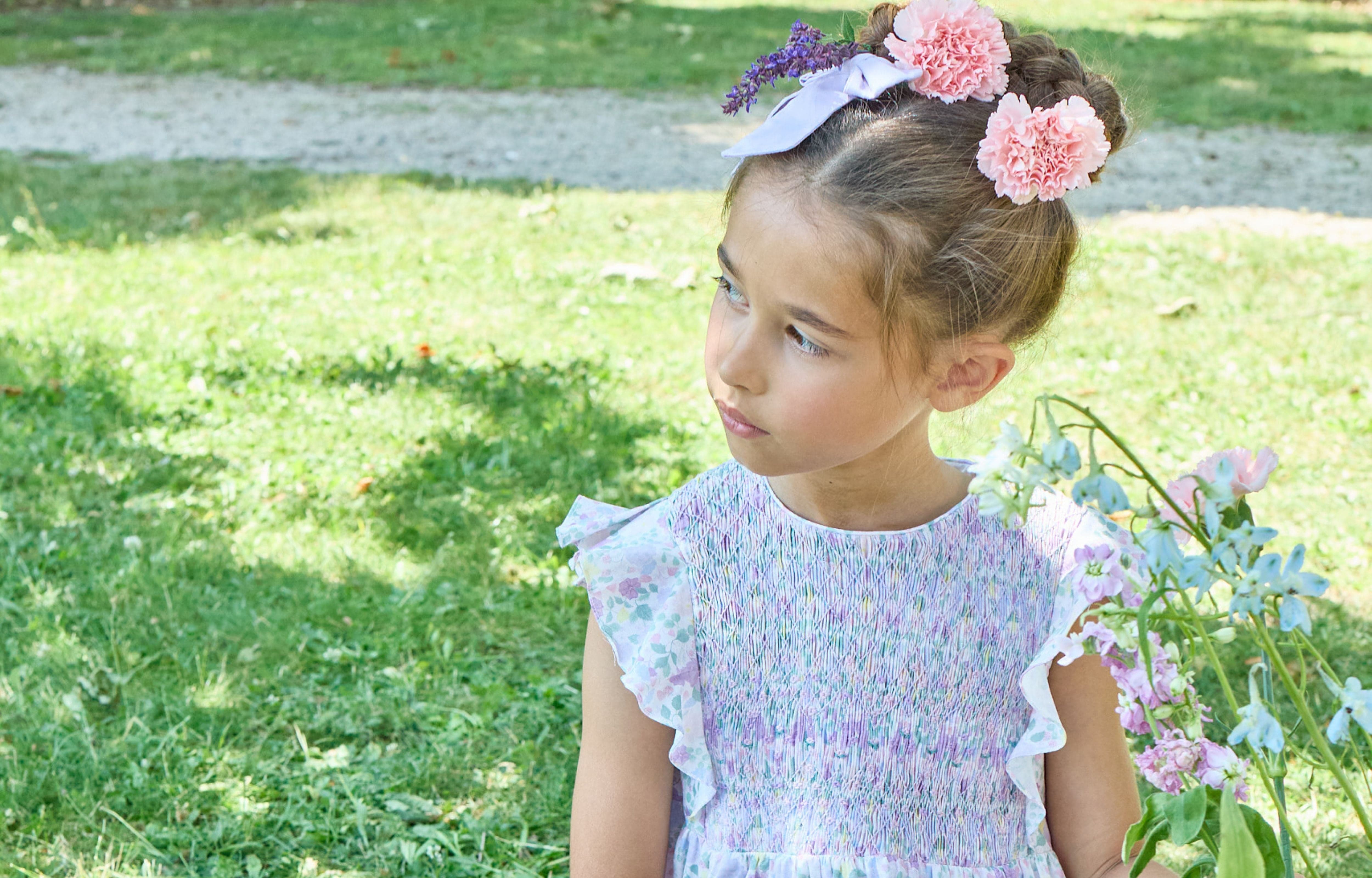 Bergénie, Blouse smockée pour fille, imprimé exclusif jardin lilas et rose